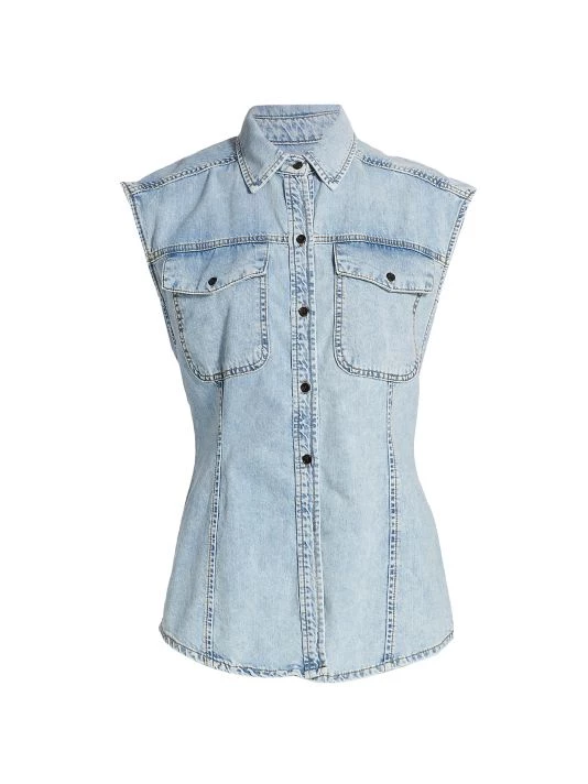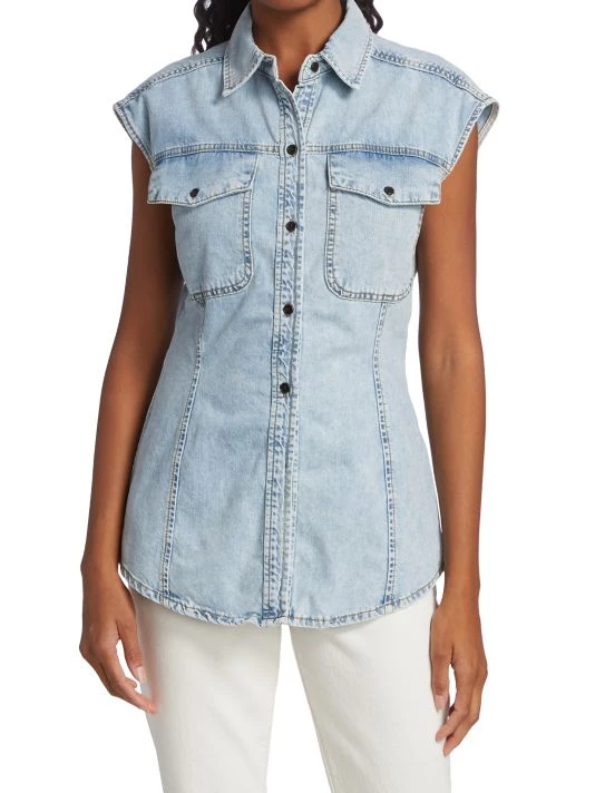 This sleeveless denim top features utilitarian chest flap pockets and a sleek slim fit.