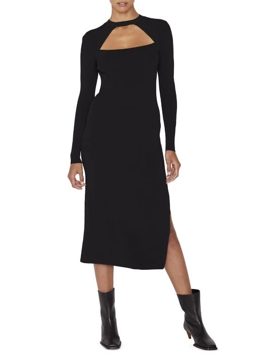 Pullover sweater midi-dress with a geometric chest cut-out and sleek side slit.