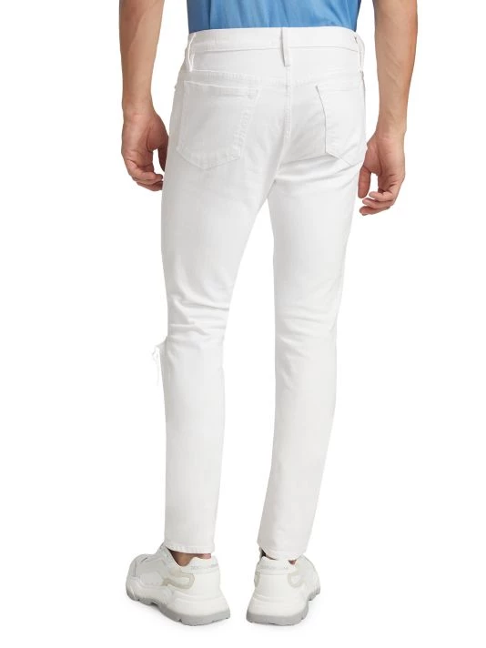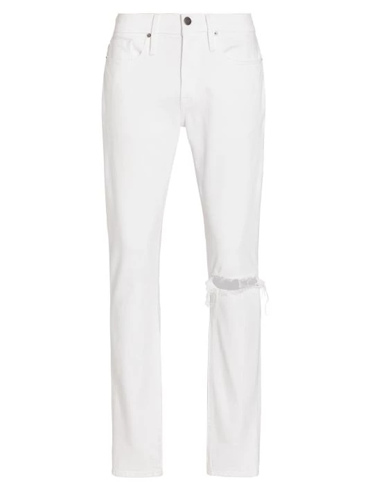 These skinny jeans in a five-pocket silhouette feature a distressed accent at the knee.