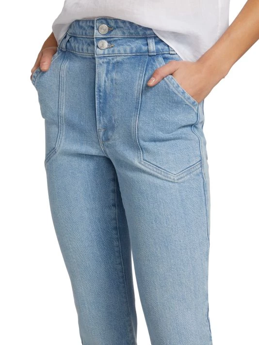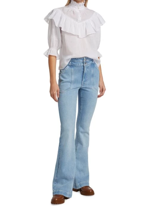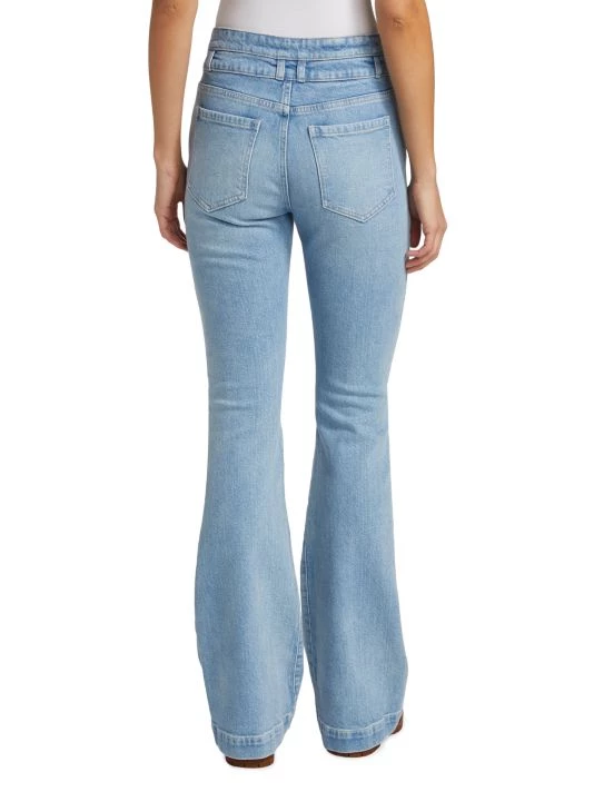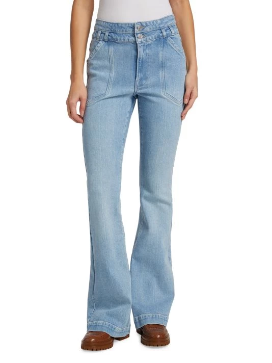 Cut in a flared-leg silhouette, these mid-rise jeans offer a double-button waist and defining front slash pockets.