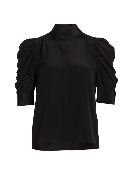 Luxe silk top features dramatic puff-sleeves and mock neck in a satin finish.