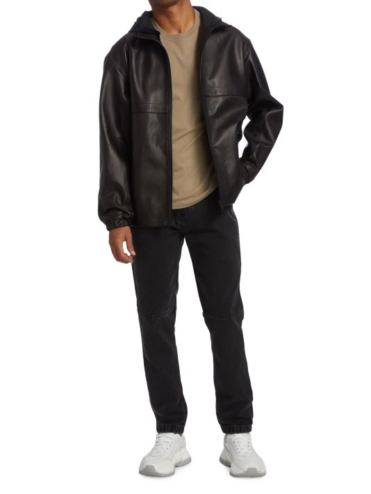 This sleek hooded jacket is crafted of sumptuous lambskin leather and features are drawcord hood.