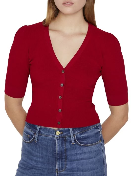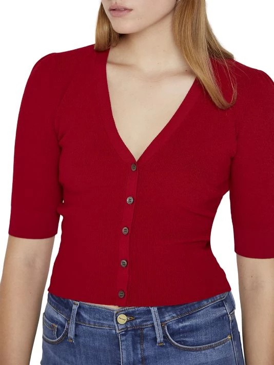 Short sleeve rib-knit cardigan in a cropped silhouette.