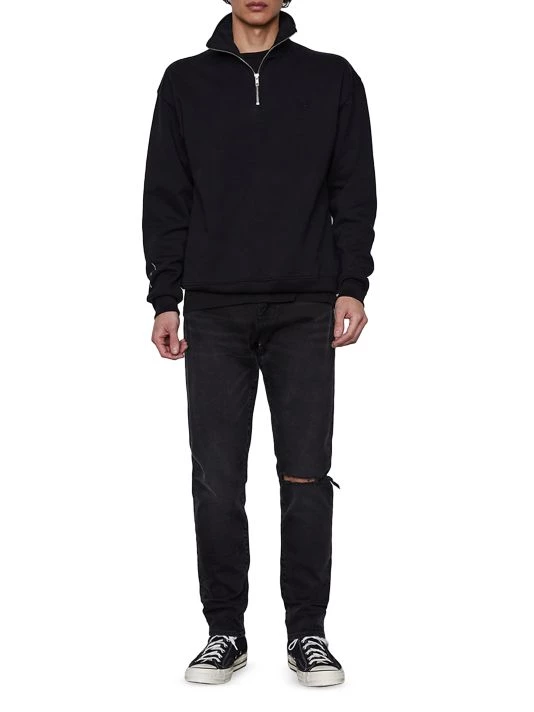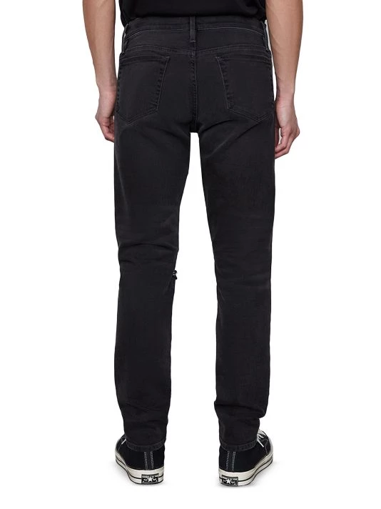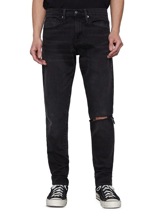 These skinny jeans are enhanced with distressed features like a faded wash and a rip at the knee.