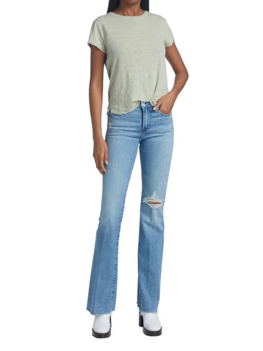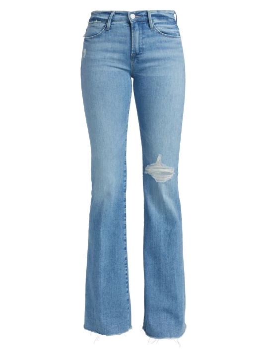 Cut in a flared silhouette, these high-rise jeans feature distressing at knee and a raw hem.