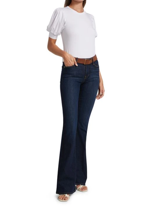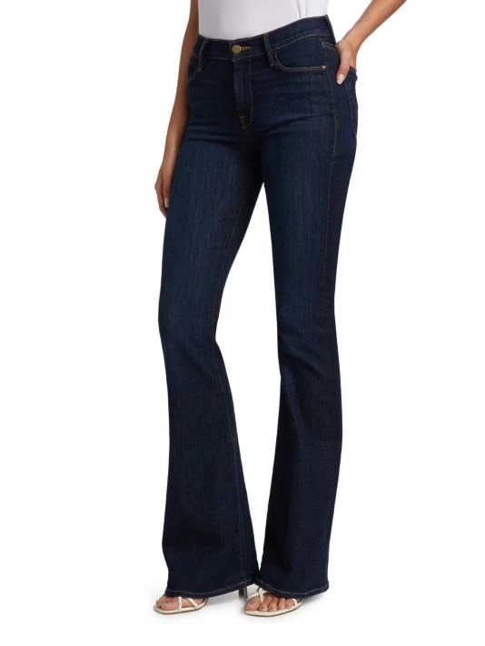 Cut with a high rise, a lengthening flared silhouette lends a retro feel to these fitted jeans.