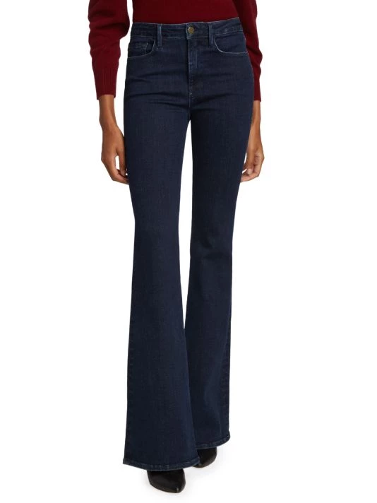 These flared leg jeans are crafted of stretch-denim to fit a wide range of sizes.