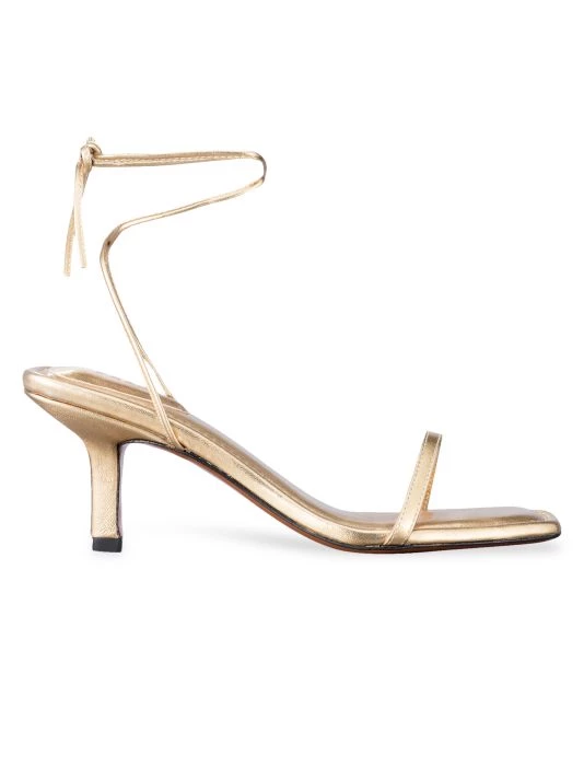 Finished with a modern square toe, these metallic leather sandals tie at the ankle.