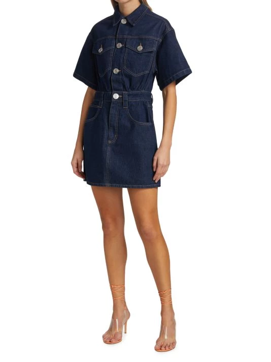 This mixed media denim minidress boasts a shirt-inspired bodice and miniskirt.