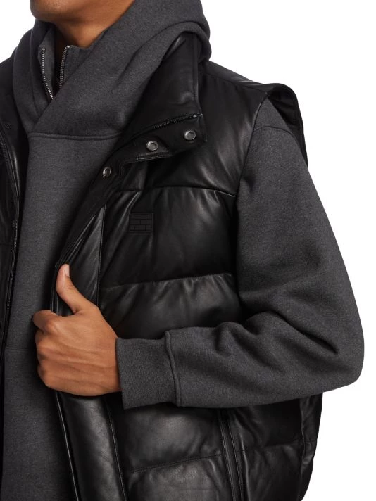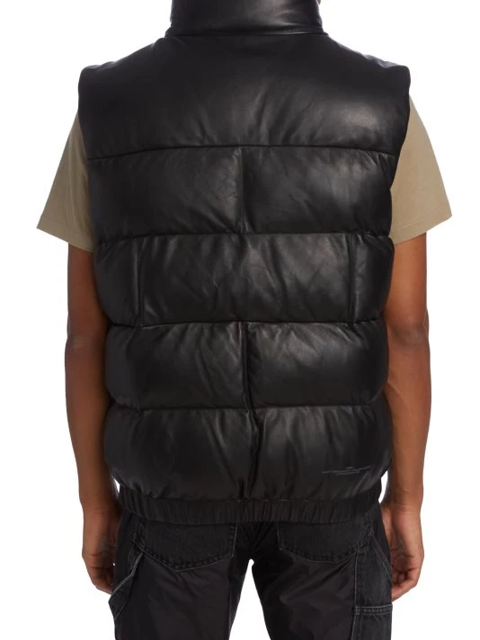 A quilted leather puffer vest detailed with a logo patch and cinched hem.