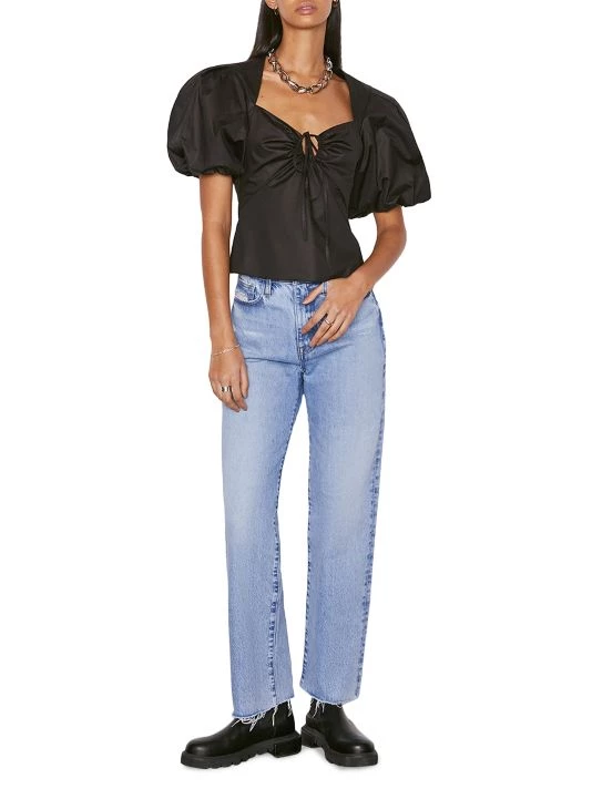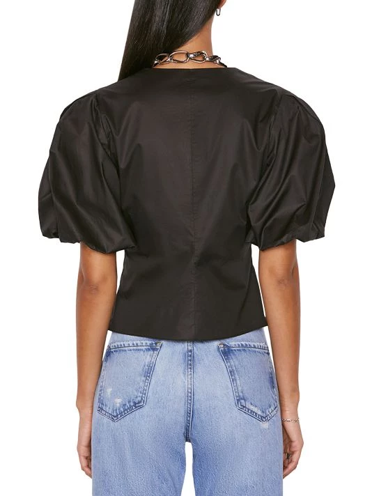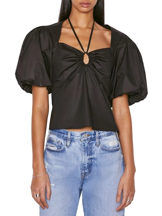 Featuring voluminous short puff sleeves, Frame’s elegant top is detailed with a V-neck with an O-ring and tie front.