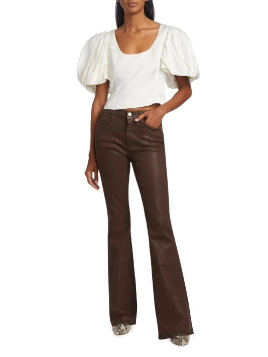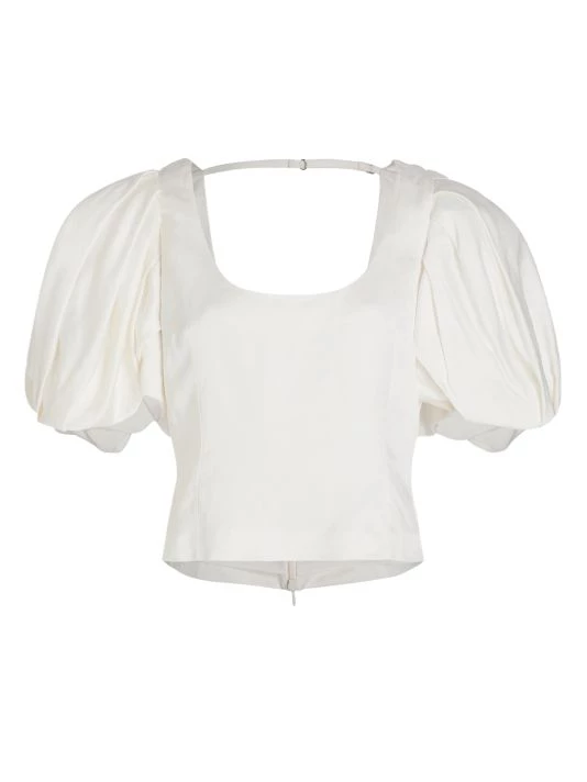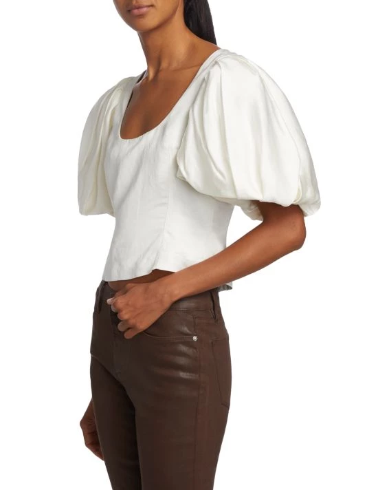 Crafted of a breathable linen blend, Frame’s top flaunts a flattering U-shaped neck and back complemented by voluminous puffed sleeves.