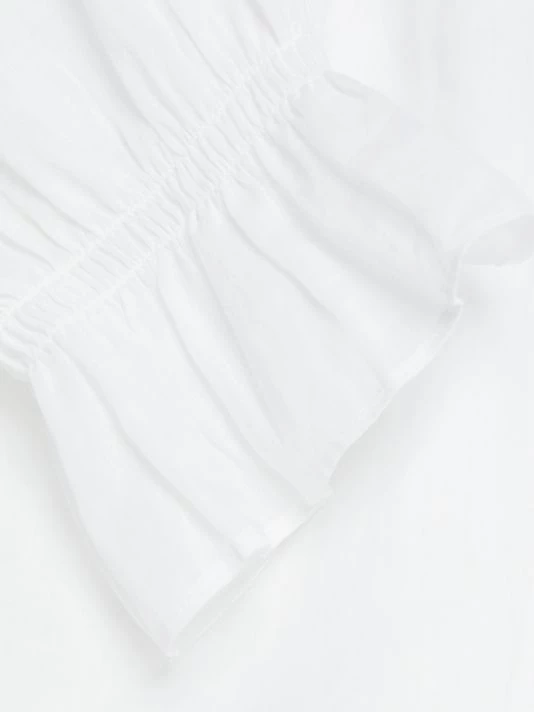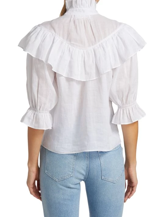 Frame’s ruffle top is crafted with a frilly high neck. This airy piece boasts flounce sleeves with a front-button placket.