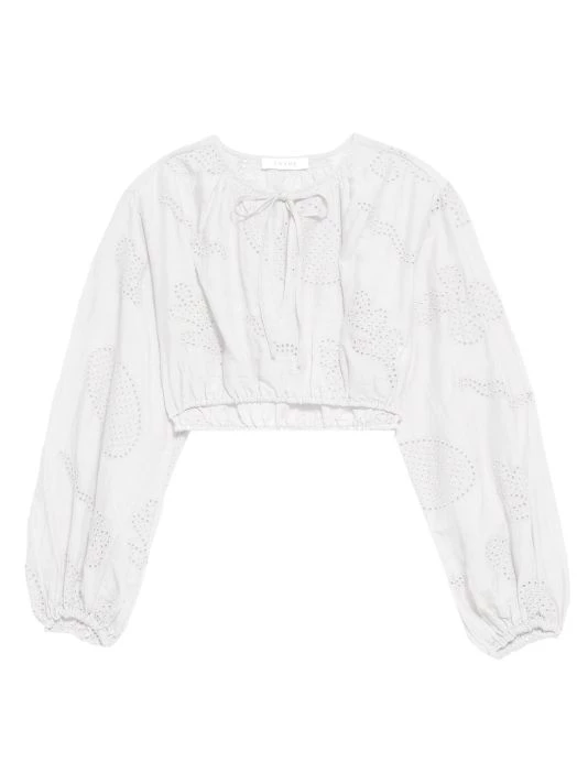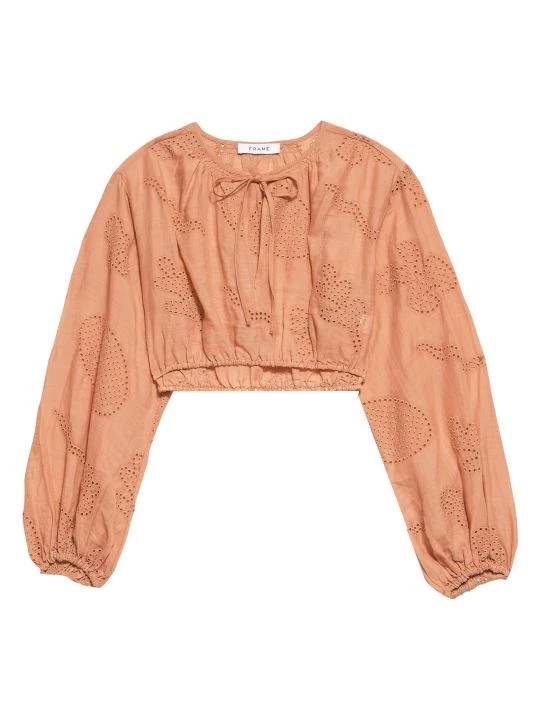 Frame’s shirred blouse is detailed with eyelet embroidery in a cropped fit.