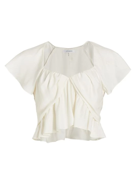 This shirred top from Frame is crafted of delicate flouncey fabric with flutter sleeves.