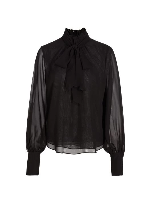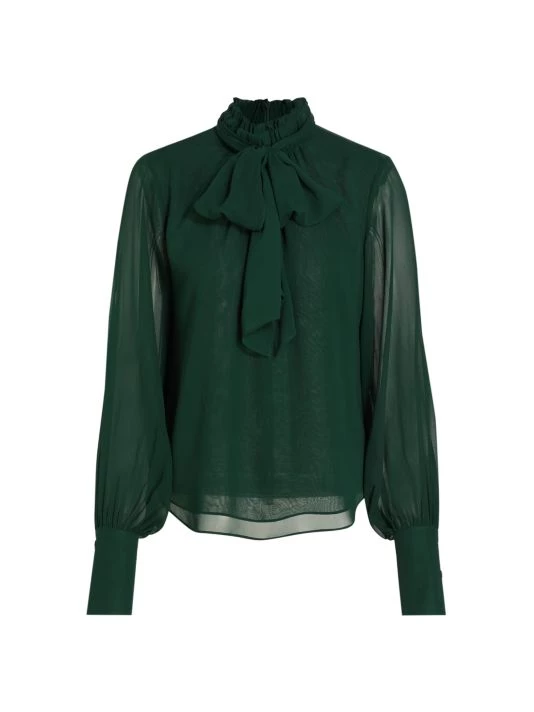 Crafted of silk, this blouse features a bow detail at the neck, and sheer puff-sleeves.