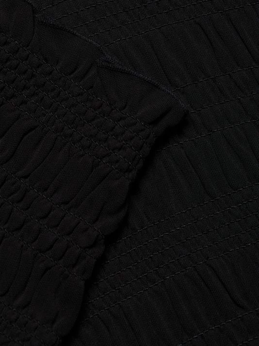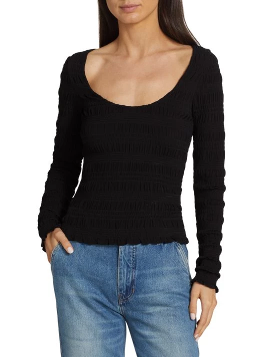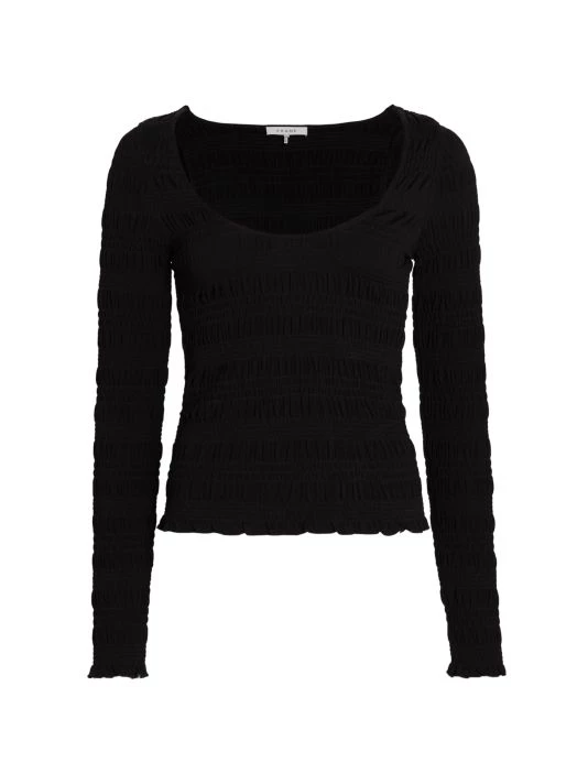 Frame’s smocked knit top features a crewneck and long sleeves.