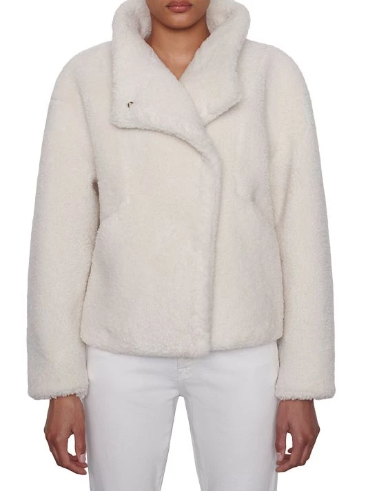 Teddy textured jacket with modern asymmetric snap closure, featuring a mock neckline and side slit pockets.