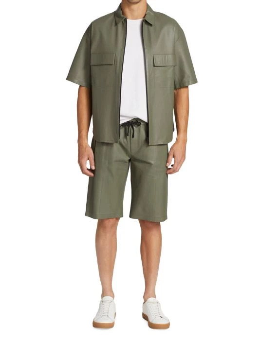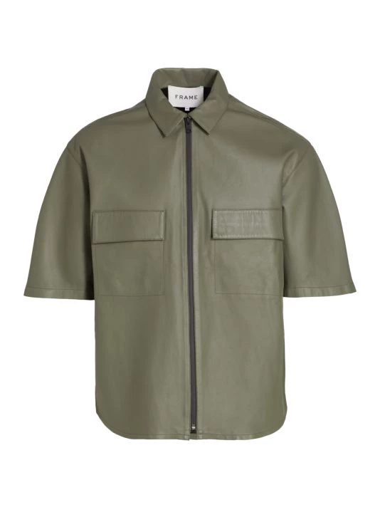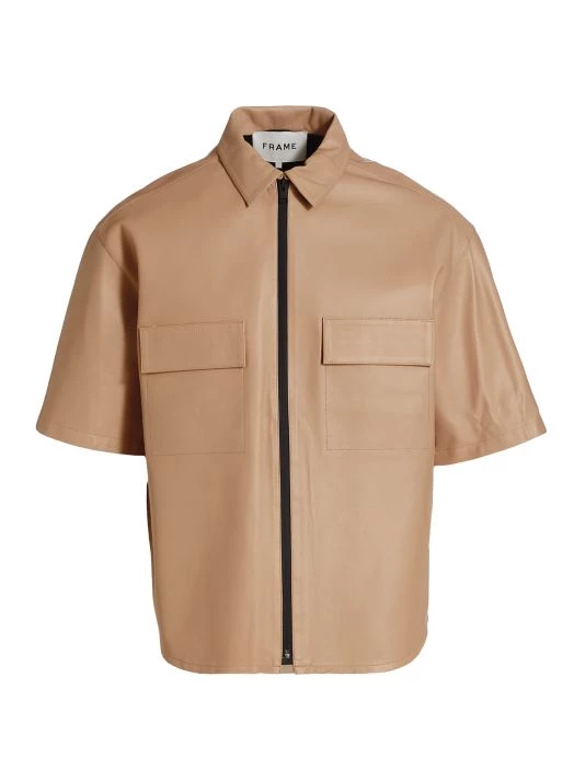 Constructed of luxurious leather, this short-sleeved shirt by FRAME features a zipper-front and chest flap pockets lending an industrial feel to the piece.
